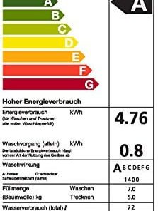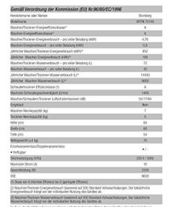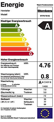 Beim Wasserverbrauch der Blomberg WTFN 75140 wird der Verbrauch mit 9.000 Liter jährlich nach (2010/30/EC) angegeben. Dies entspricht einem durchschnittlichen Wasserverbrauch pro Waschgang von 40,91 Litern, was wirklich gut ist. Einer der wenigen Kombigeräte, die so manche Waschmaschine damit in den Schatten stellt. Liegt der Verbrauch unter 49 Litern kann man von gutem Standard sprechen. Die jährlich anfallenden Mehrkosten bewegen sich in einem soliden Bereich 37 EUR – damit kostet jeder Waschgang im Mittel etwa 0,17 Cent.