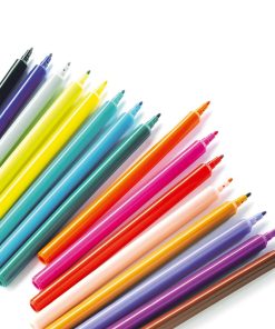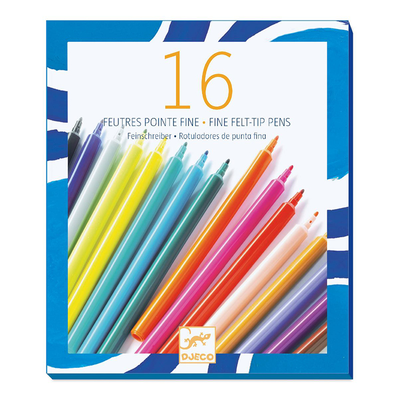 Dieses Filzstift-Set von DJECO kombiniert 16 unterschiedliche Farbtöne. Mit der dünnen Spitze können filigrane Linien gezeichnet werden, zudem ist sie besonders robust. Die Farben sind gut von Kleidung und Haut abwaschbar.
