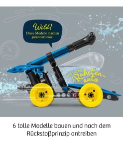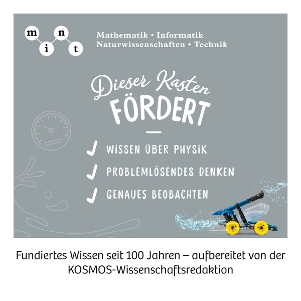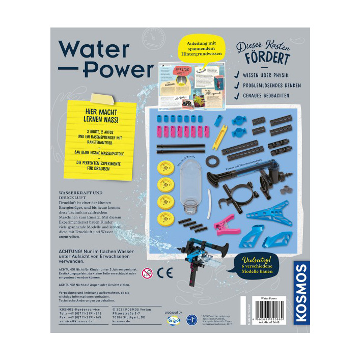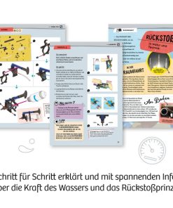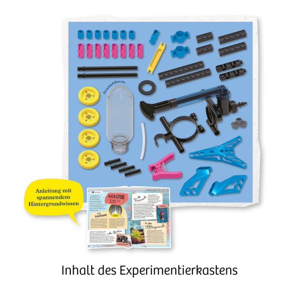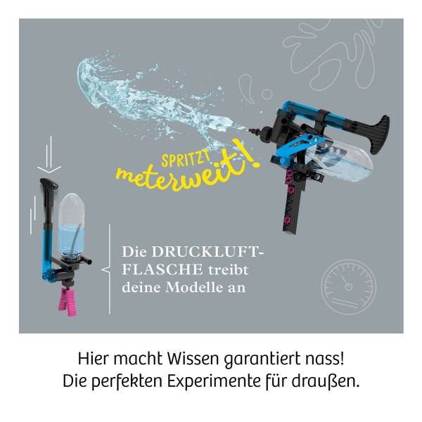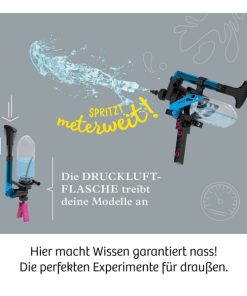 Aus den in diesem Set enthaltenen Steckteilen entstehen sechs coole Modelle, die alle mit Wasser vollgetankt werden – und schon geht’s ab! Ob Weitschuss-Wettbewerb mit der Wasserpistole oder lustige Spiele mit dem Sprinkler: Garantiert ist neben einer Menge Spielspaß auch das Aneignen von Wissen rund um die erneuerbare Energie. Der Kern des Ganzen: die besondere Druckluftpumpe, die für jedes Modell als einzigartiger Raketenantrieb dient. Mit spannenden Experimenten wird erforscht, wie Wasserkraft und Druckluft zusammen wirken.