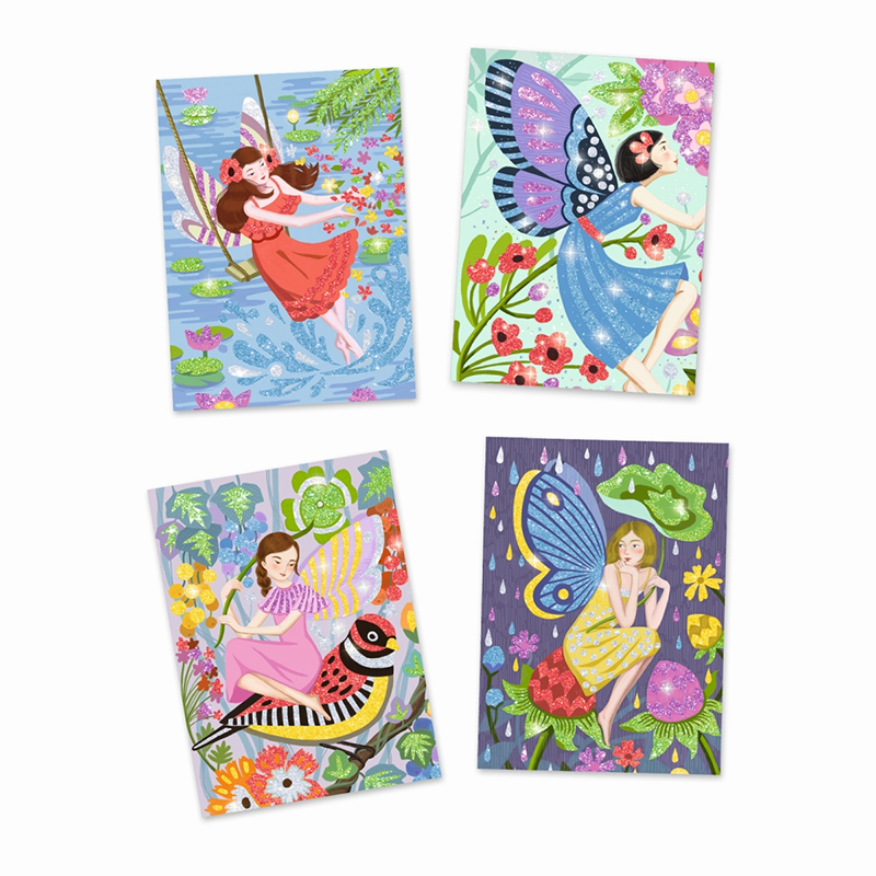 Dieses Kreativ-Set von DJECO beinhaltet vier schöne Bilder, die mit Glitzersand zum Funkeln gebracht gebracht werden. Um keinen zu verstreuen, werden die Bilder-Kärtchen in eine Box gelegt, die Klebefolien abgezogen und anschließend mit Glitzerpulver nach dem im Heft angegebenen Farbcode bestreut. Natürlich kann man sich, was die farbliche Gestaltung angeht, aber auch komplett austoben!