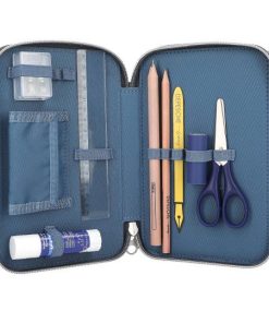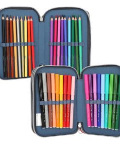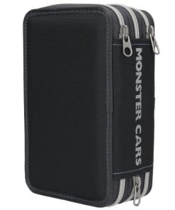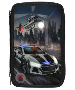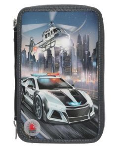 Die Vorderseite hat ein supercooles Motiv mit einem Polizei-Rennwagen und -Hubschrauber vor nächtlicher Skyline. Das Beste: Drückt man auf den Start-Knopf, blinken/leuchten Blaulicht, Lichter und Scheinwerfer für ca. 20 Sekunden. Die drei separaten Fächer haben ein Reifenabdruck-Muster und sind komplett gefüllt mit je 18 Bunt- und Filzstiften, 2 Bleistiften, Anspitzer, Radierer, Lineal, Klebestift, Schere und einem kleinen Klett-Täschchen.