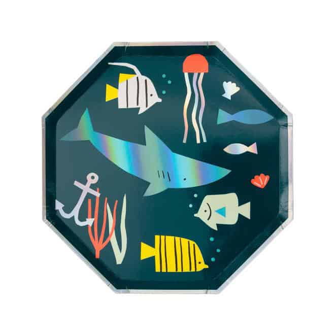 Das Auge isst bekanntlich mit. So wirkt jedes Geburtstagsessen dank dieser stylishen Pappteller von Meri Meri gleich noch viel cooler und schmackhafter! Die im Unterwasser-Stil gehaltenen Partyteller sind unter anderem mit Haien, Quallen, Fischen und Ankern verziert.