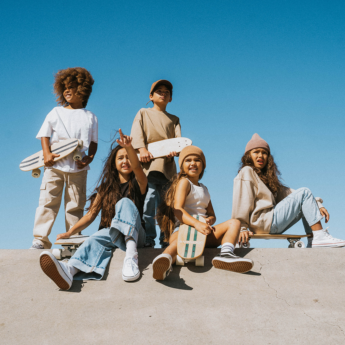 Die Skateboard-Kollektion von Banwood entführt coole Kids ins Kalifornien der 1970er-Jahre: Hier treffen nostalgische Designs mit verspielten Vintage-Elementen auf dezente Pastelltöne. Hergestellt wird das kleine Cruiser-Board, das sich sowohl für Anfänger als auch erfahrene Fahrer eignet, aus natürlichem, kanadischem Ahornholz. Das Deck verfügt über einen weichen, transparenten Grip, der speziell auf Kinderfüße abgestimmt ist.