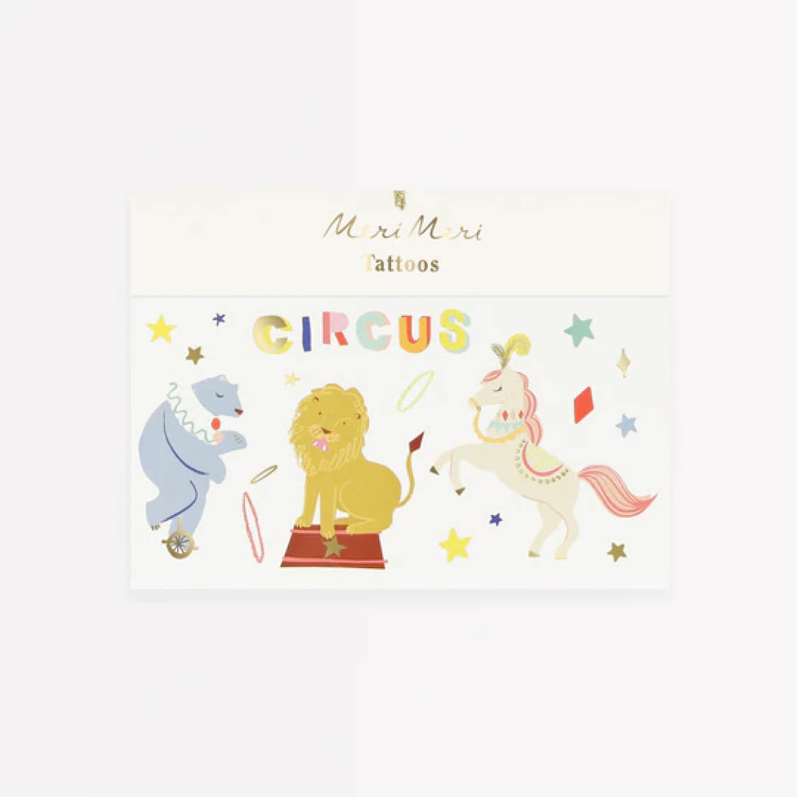 Auf der nächsten Zirkus-Mottoparty oder Faschingsfeier sind diese Tattoos von Meri Meri ein Muss: Das Set beinhaltet mehrere Abziehbilder mit Motiven aus der Zirkus-Welt, die man sich einfach auf die Haut kleben kann. Ebenso leicht sind sie natürlich auch wieder zu entfernen.