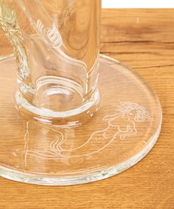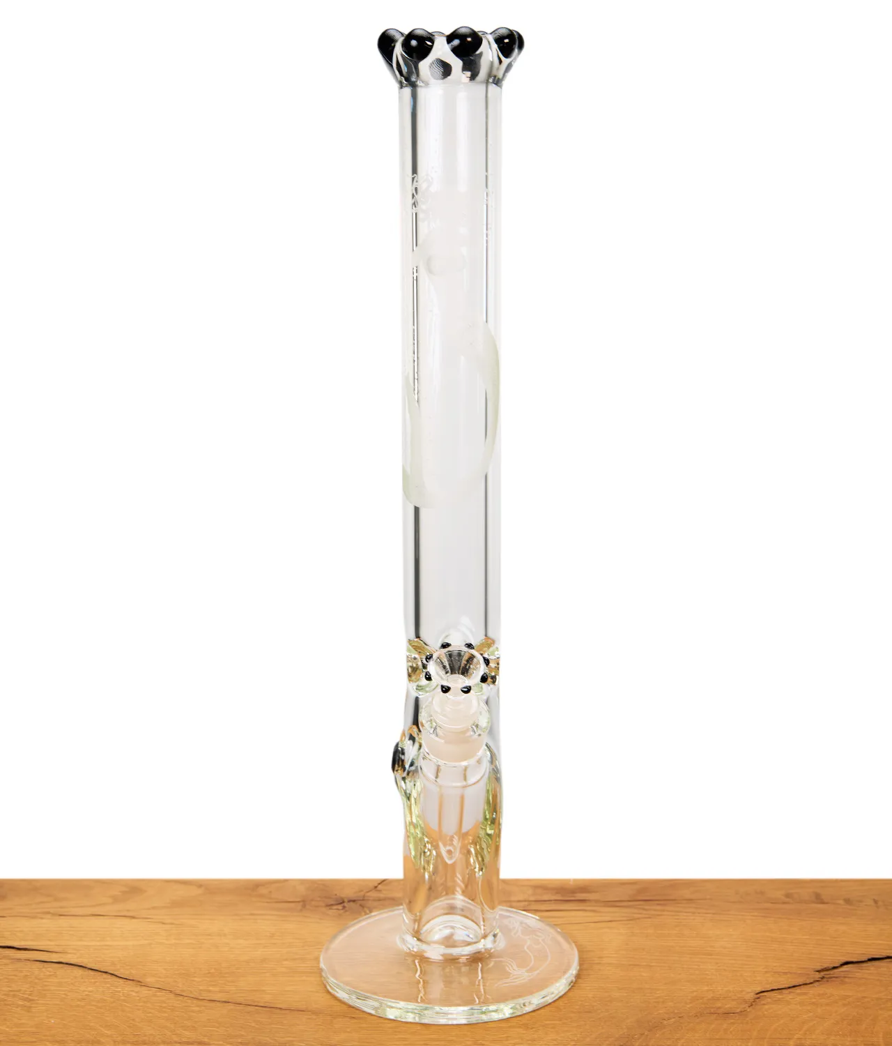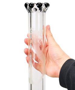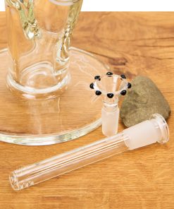 Die Gravuren am Rohr und dem 145 mm breiten Rundfuß sind das Ergebnis präziser Handarbeit und machen die Bong zum Eyecatcher jeder Sammlung. Das schwarze Kronenmundstück setzt dabei einen edlen Kontrast zum klaren Glas und rundet das beinahe majestätisch wirkende Design perfekt ab.